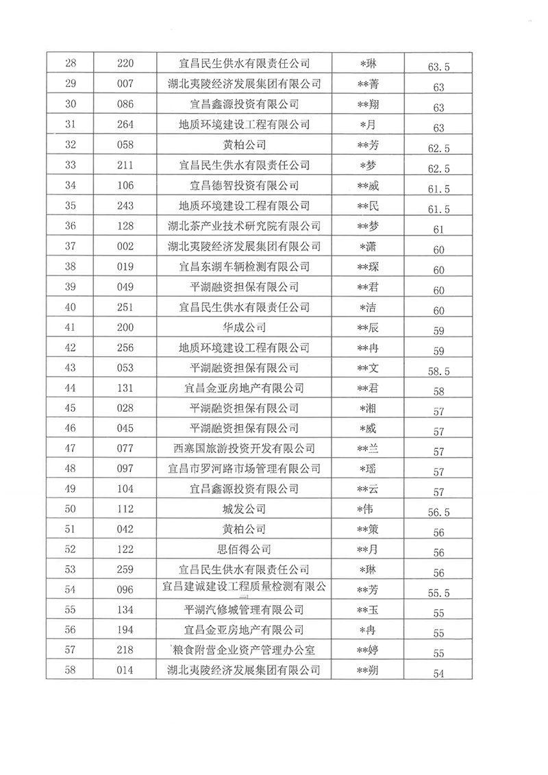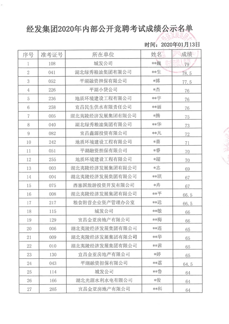 根据湖北夷陵经济发展集团有限公司《内部竞选管理人员实施方案》要求,现将笔试成绩予以公示,公示时间为2020年1月13-15日,欢迎广大职工监督。如对成绩有疑议者,请本人于2020年1月15日上午12:00前到劳动组织人事部书面申请查询,逾期不予受理。