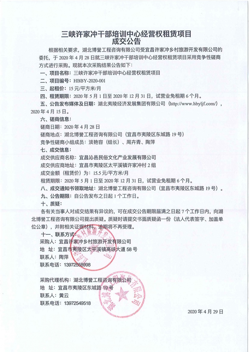 三峡许家冲干部培训中心经营权租赁项目成交公告