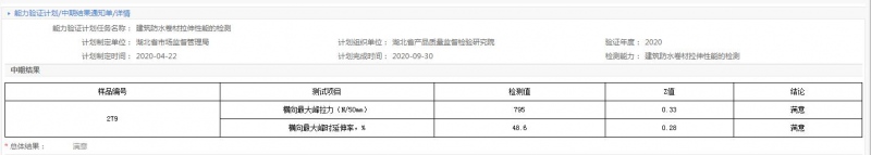 (通讯员:康建农)6月15日,建诚检测公司参与湖北省产品质量监督检验研究院组织的2020年建筑防水卷材拉伸性能检测,7月16日公布能力验证结果为满意,此次能力验证结果真实反映了建诚检测公司检测能力和水平。