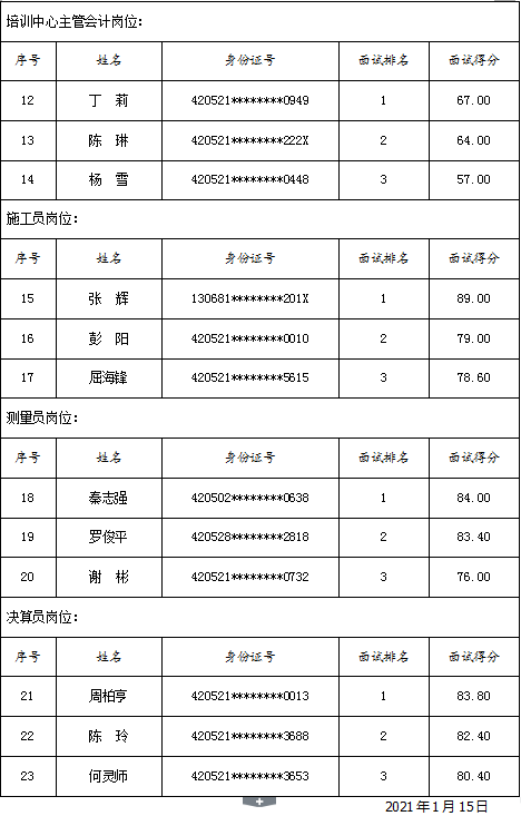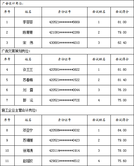 1月15日,经发集团公开招聘面试工作顺利结束,根据集团公开招聘工作要求,现将面试成绩予以公示,欢迎广大干部职工监督。受理电话:0717-7105839
