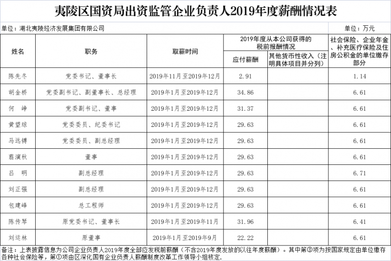 夷陵区国资局出资监管企业负责人2019年度薪酬情况表