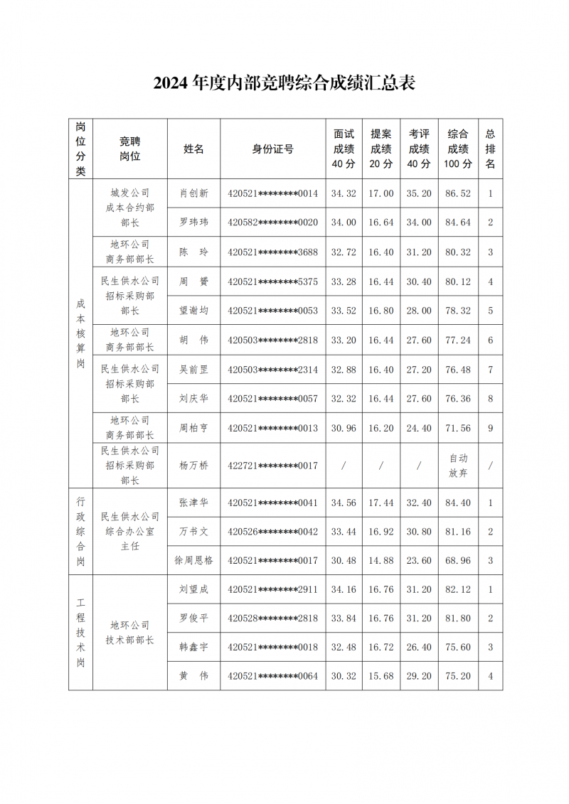 根据《湖北夷陵经济发展集团有限公司2024年度内部竞聘公告》,现将本次内部竞聘综合成绩予以公示,欢迎广大干部职工监督。